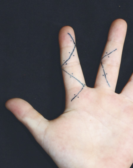 The patient in Fig. 3‑3 has sustained flexor zone 2 tendon injuries to four fingers secondary to a knife laceration. As his hand was clenched at the time, the level of tendon injury differs from the level of skin injury when the hand is relaxed. Midlateral access was performed in all digits within 45 minutes, before repairs were performed (Fig. 3‑3). The incision is marked by flexing the digit and marking a point at the end of the flexion crease at each joint (Fig. 3‑4).