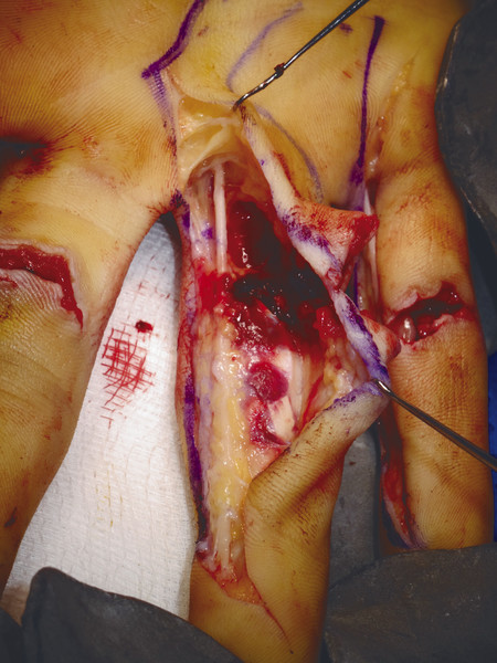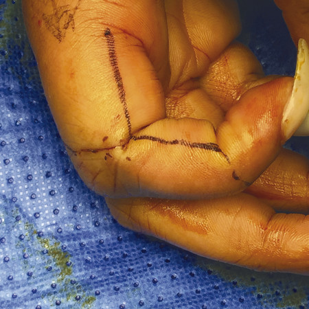 In children, Bruner-type incisions should be used as midlateral incisions which can often migrate volarly with growth, resulting in flexion contractures (Fig. 3‑2).