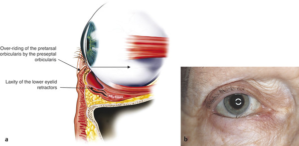 Laxity, dehiscence, or disinsertion of the lower eyelid retractors ( Fig. 3‑1a).