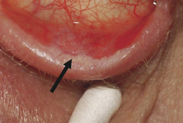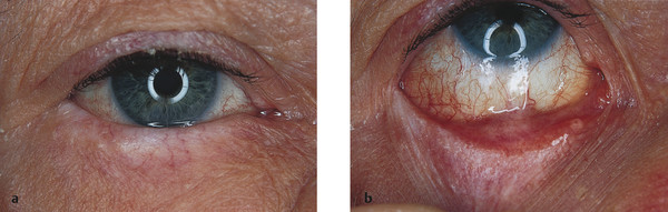 The patient should undergo a careful naked eye and slit-lamp examination to determine the cause of the entropion (e.g., a corneal foreign body causing a spastic entropion) and to determine the most appropriate treatment. The conjunctiva is examined to exclude scarring, symblepharon, or keratin on the posterior lamella (Fig. 3‑5).