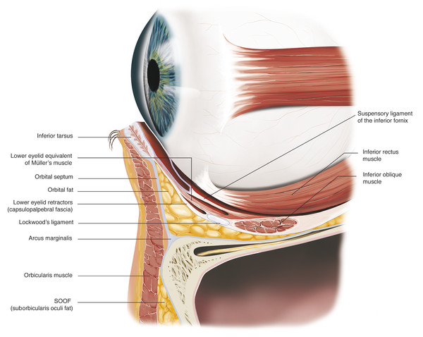 The anatomy of the lower eyelid resembles that of the upper eyelid. Although the tarsus is much smaller, the capsulopalpebral fascia is analogous to the levator aponeurosis. The smooth muscle fibers accompanying this fascia are analogous to Müller’s muscle. Lockwood’s ligament is analogous to Whitnall’s ligament. The fat in the lower eyelid lies posterior to the septum but anterior to the capsulopalpebral fascia and is analogous to the upper lid preaponeurotic fat. There are three fat pads in the lower eyelid: medial, central, and lateral. These lie between the capsulopalpebral fascia and the orbital septum. The inferior oblique muscle lies between the medial and central fat pads. The central and lateral fat pads are separated by the arcuate expansion.