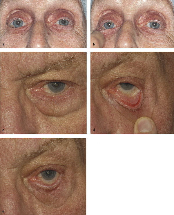 The eyelid should be assessed for horizontal laxity. The eyelid should be drawn medially and laterally to determine the degree of medial and lateral canthal tendon laxity (the “distraction” test). It is unusual to have significant medial canthal tendon laxity in lower lid entropion, and it is extremely rare for this to require surgical correction. This is in contrast to the situation with lower lid ectropion. The eyelid should be drawn away from the globe to determine the degree of laxity of the tarsus. It should only be possible to draw the eyelid approximately 2 to 3 mm from the globe. This is the “pinch” test (Fig. 3‑6a,b). The eyelid is then drawn inferiorly and released. This is the “snap” test (Fig. 3‑6c–e). The eyelid should return to lie in apposition to the globe without a blink. Failure to do so suggests significant eyelid laxity.