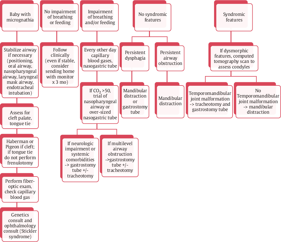 Although a stepwise approach to the establishment of an adequate airway is recommended, rapid progression through the following airway management algorithm is often required in children with micrognathia: