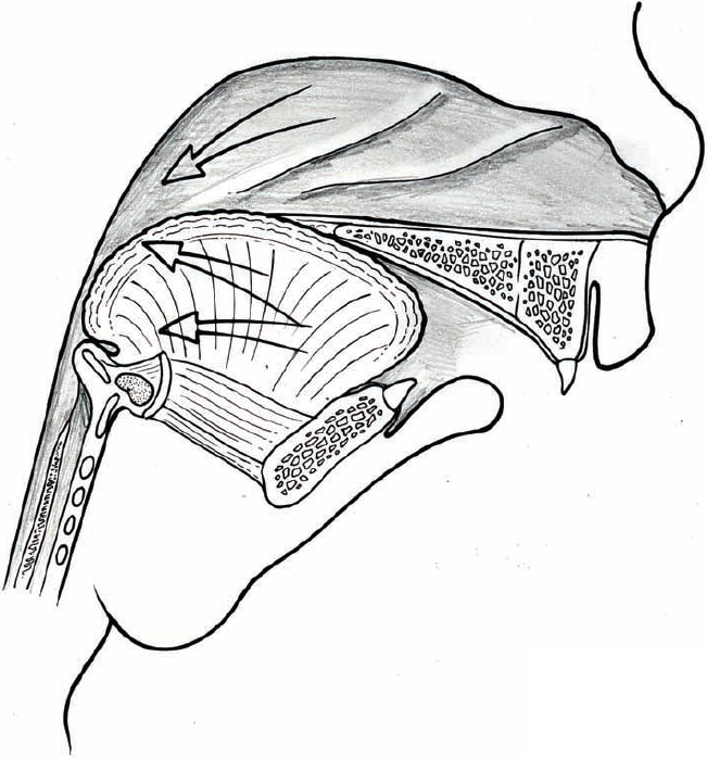 An overarching theme in the management of the glossoptotic infant is the causal relationship between airway obstruction and feeding efficiency. An infant with normal oropharyngeal anatomy is able to breathe and feed simultaneously (a feat that results in choking, gasping, and aspiration if attempted in older individuals). This ability is related to at least two characteristics of the infantile larynx, including (1) a cephalad position of the infantile larynx compared to an adult, and (2) its interdigitation with the uvula and soft palate. This relationship produces an effective separation of the air exchange occurring between the nasal cavity, larynx, and tracheobronchial tree anteriorly within the laryngopharynx and the upper digestive tract of the oral cavity, oropharynx, hypopharynx, and esophagus posteriorly and laterally.