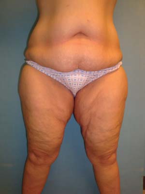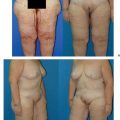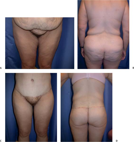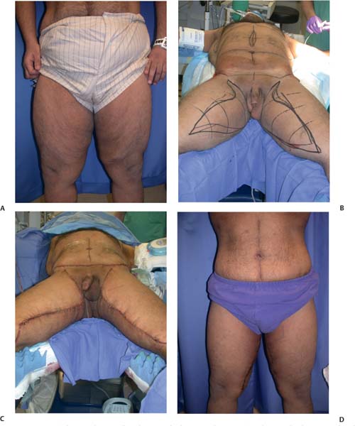 There is a subgroup of patients who have sustained MWL who demonstrate skin laxity but still have disproportionate significant lipodystrophy. The plan is to treat these patients in two stages: the first stage is liposuction, and the second stage is vertical thigh lift after appropriate deflation has been achieved ( Fig. 30.6 ). In actuality, it is rare for these patients to present for both stages, for financial reasons or due to failure to maintain adequate weight loss.
