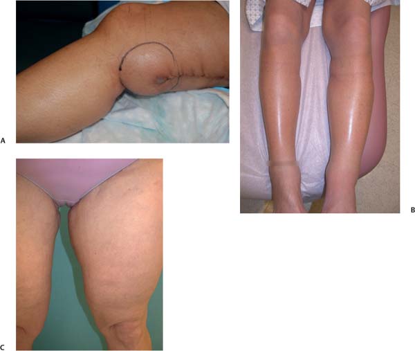 There is heterogeneity in the vertical, extended thigh lift techniques described by different authors. Several surgeons discuss the benefit of using liposuction to prevent injury to lymphatics and veins, while also improving contour.9,13 Other surgeons caution against the use of liposuction in body regions undergoing excision, recommending that surgery be staged in these cases, with liposuction designated as the first stage. All agree that vertical thigh lifting provides the best outcome for patients with significant skin laxity and poor skin quality extending to, and beyond, the knee ( Fig. 30.1 ). In exchange for the dramatic results, the patient accepts a visible scar with a risk of irregularity in the junction between the anterior and posterior thigh, as well as the accompanying risks of lymphedema and lymphoceles9,14,15 ( Fig. 30.2 ).