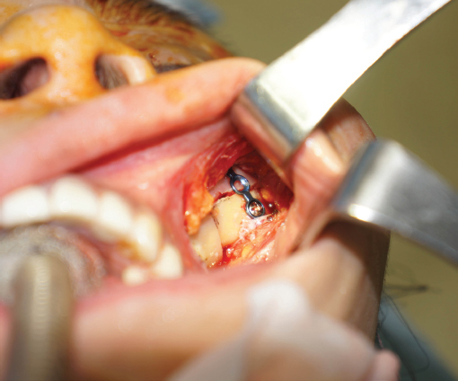 The zygoma is then infractured with a mallet. Fixation is achieved with a three-hole miniplate and screws ( Fig. 30.4 ). The preauricular incisions are closed with polypropylene suture, and the sublabial incisions are closed with an absorbable polyglactin suture. Bulky compressive dressings are kept for 3 days, and then replaced with an elastic headband.