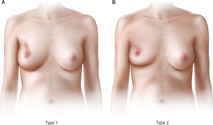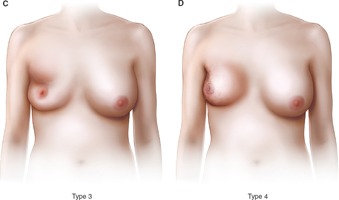 A number of classification systems are used to describe the BCT deformity. The Clough classification system, presented in Chapter 24, has classifications that range from a breast with preserved shape, no deformity, and some asymmetry in volume (type 1), to a breast with severe retractile fibrosis of the entire breast (type 3). Another useful morphologic classification of partial deformities was described by Berrino et al 2 and is described in the following text.