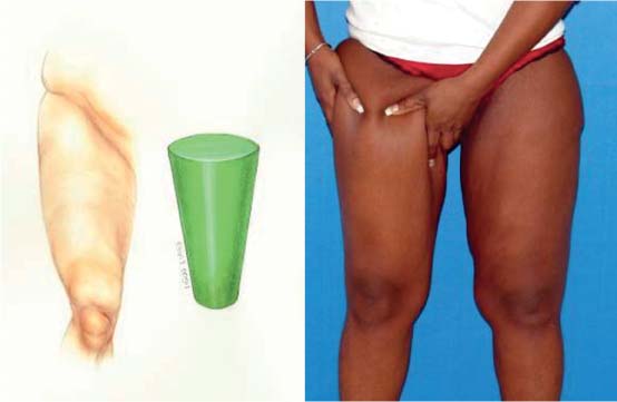 An algorithm of medial thighplasty must consider differences in patients’ anatomy. With experience, we have noted two basic shapes of the thigh that result after weight loss: a funnel or cone shape, and a cylinder shape ( Figs. 31.1 and 31.2 ). The cone shape consists primarily of superior or proximal excess with little to no distal excess skin. In these cases, medial thigh contouring with a horizontal excision without a vertical excision can allow for a circumferential tightening of the thigh while avoiding a vertical medial thigh scar down to the knee, which is much less aesthetically pleasing. Patients with cylinder- shaped thighs, on the other hand, present with significant horizontal and vertical excess skin with ptosis that extends down to the knee. In these cases, it has been found that both the horizontal and vertical excisions are necessary for the optimal result. We reserve the vertical excision for patients with severe skin excess distally to the knee, as redraping after a horizontal excision is sufficient for the majority of deformities.