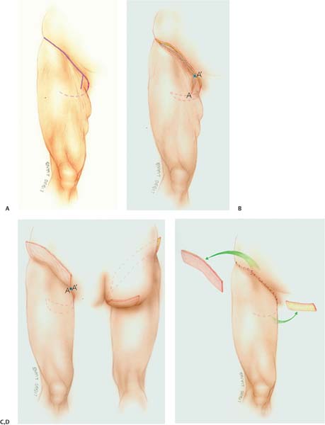 Initially, we combined wide undermining of the medial thigh flap with liposuction along the medial thigh to the knee. Experience demonstrated that this resulted in vascular compromise that caused a higher than desired rate of me-dial thigh wound edge necrosis, dehiscence, and infection. As a result, we now perform a more limited medial thigh flap dissection with liposuction. The complication rate has decreased noticeably with this modification, as blood supply is more preserved. The discontinuous undermining with liposuction allows for redraping of the medial thigh flap as well as recontouring by fat excision.