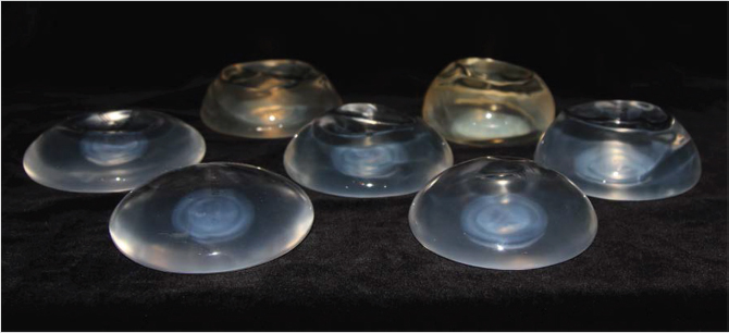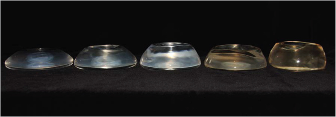 Fig. 32.6 Side profile of various silicone gel implants. From left to right: Allergan Natrelle Style 10 300cc, Allergan Natrelle Style 15 304cc and Allegan Natrelle Style 20 325cc, Allergan Natrelle Style 40 300cc, and Allergan Style 45 320cc.