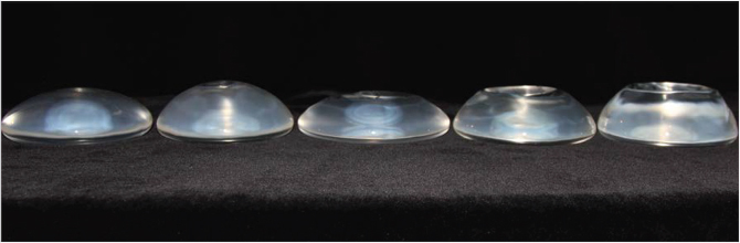 Fig. 32.5 Side profile of various silicone gel implants. From left to right: Allergan Natrelle Inspira SRM 310cc, Allergan Natrelle Inspira SRF 295cc, Allergan Natrelle Style 10 300cc, Allergan Natrelle Style 15 304cc, and Allegan Natrelle Style 20 325cc.