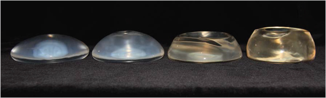 Fig. 32.7 Side profile of various silicone gel implants. From left to right: Allergan Natrelle Inspira SRM 310cc, Allergan Natrelle Inspira SRF 295cc, Allergan Natrelle Style 40 300cc, and Allergan Style 45 320cc.