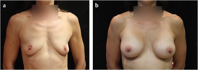 Fig. 32.8 (a,b) Preoperative and postoperative photos, respectively, of a patient with significant breast deflation. Augmentation was performed with shaped anatomical implants in a dual-plane II fashion.