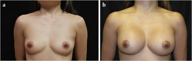 Fig. 32.9 (a,b) Preoperative and postoperative photos, respectively, of a patient desiring larger breasts. A round silicone implant was placed in a dual-plane I fashion.