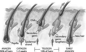 Three phases of hair growth: Anagen, catagen, and telogen (Fig. 32-1)