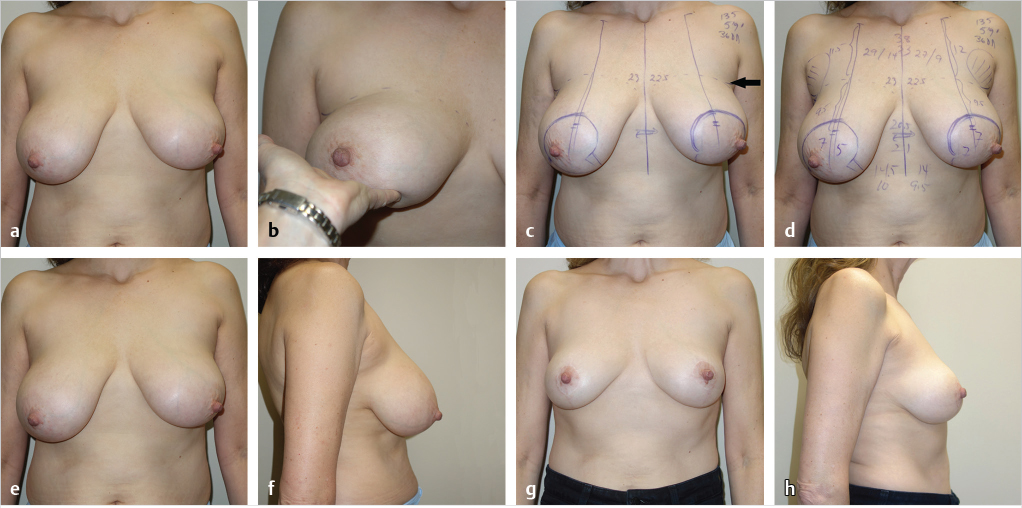 The breast can be rotated medially and laterally and the vertical limbs can be matched up to the chest meridian the way Marchac, Lassus, and Lejour described. The vertical limbs for an inverted T, inferior pedicle breast reduction tend to be a bit wider because the skin is used as a brassiere. The superomedial vertical breast reduction relies on parenchymal reshaping after excision of parenchyma where it is in excess; it is not a skin brassiere operation so it is important not to take out too much skin. She had 230 g removed from her right breast and 190 g from her left breast. She had another 150 cc of fat removed by liposuction. She is shown at 18 months after her breast reduction (▶Fig. 32.1e–h).