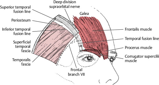 Just medial to the temporal ridge, the layers of the deep galeal plane of the forehead and scalp bond with the underlying periosteum and fuse to bone within a 5-6 mm wide zone of fixation (Fig. 33-2).