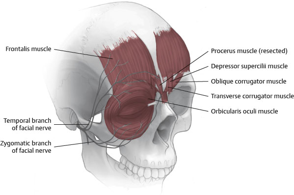 The medial eyebrow segment is less mobile than the lateral segment because of the anchoring effect produced by the supraorbital and supratrochlear nerves that exit bone and pass through the overlying medial frontalis muscle.