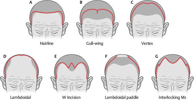 Atypical hairline patients are often challenging, with thin or balding hair. Often, small incisions for endoscopic-assisted procedures or custom incisions are made for these patients (Fig. 33-4). For males who have residual hair in the temporal scalp area, the limited incision procedure is often appropriate.