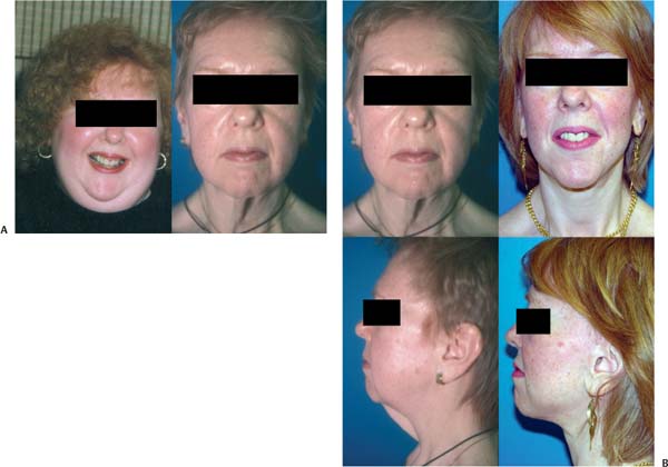These patients may also have early signs of jowling, prominent nasolabial folds, and laxity of the facial skin, depending on their age. The presence and extent of these changes should be documented. Older patients who have undergone MWL have more advanced stages of these changes. Younger patients who underwent their weight loss earlier may not yet have these findings. We have observed that skin contraction in patients younger than 40 to 45 years of age may be sufficient to decrease the incidence of the aforementioned facial deformities; these patients may not require much or any facial rejuvenation surgery as a result ( Fig. 33.5 ).