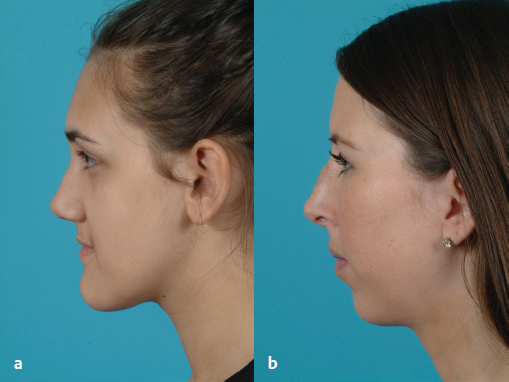 Imaging on frontal view is more difficult than on profile view because the nose is contrasted against the flesh-colored background of the face. However, shadows may still be moved in sophisticated computer programs on frontal view to illustrate possible changes. The profile view is easier to manipulate in twodimensional imaging programs as the skin is contrasted against a blue background. Profile alignment, tip projection and rotation, the alarcolumellar relationship, nasal length, and chin projection are amongst the most common parameters addressed on computer imaging. Finally, it must be emphasized to the patient that computer images serve as proposed changes only rather than guaranteeing a final result. Newer threedimensional imaging software that requires special cameras is increasing in popularity but is beyond the scope of this chapter.