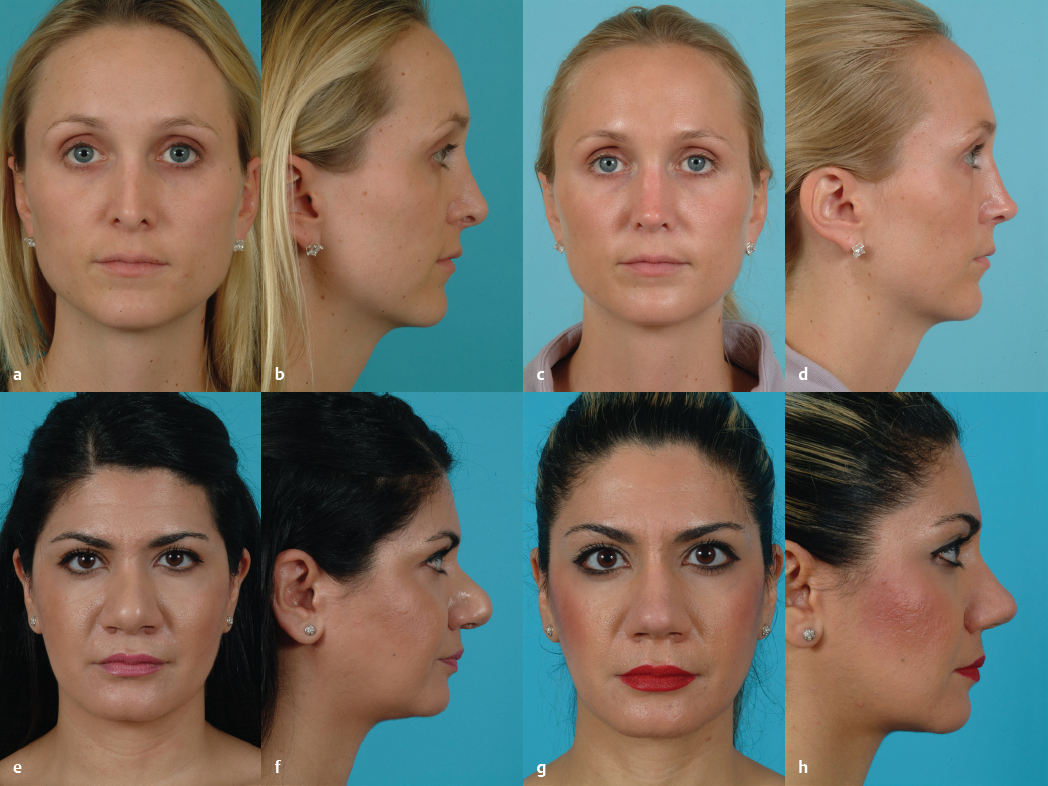 A thorough and systematic physical exam with accurate diagnosis is critical to a successful operation. The general shape of the face, the horizontal thirds, and the vertical fifths should be analyzed. Global assessment of nasal deformities in context to the remaining facial features often shows one or two readily noticeable problem areas. These deformities should be prioritized during surgery, as modification of any nasal structure influences the appearance of neighboring structures. 7 The patient’s ethnicity, the surgeon’s sense of aesthetics, and the surgeon’s ability to create a desired shape are other factors to be taken into consideration. Furthermore, body stature plays an important role as well. A patient of short stature may tolerate a more rotated nose better than a tall patient. Similarly, the degree of appropriate nasal projection depends on the projection and shape of the chin and mandible. For instance, an overprojected nose may not appear as unsightly in a patient with a strong chin and mandible as in a patient with a weaker chin and mandible. Conversely, an adequately projected nose may appear overprojected in a patient with an underprojected or retrognathic chin ( Fig. 33.1 ).