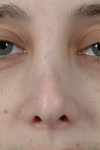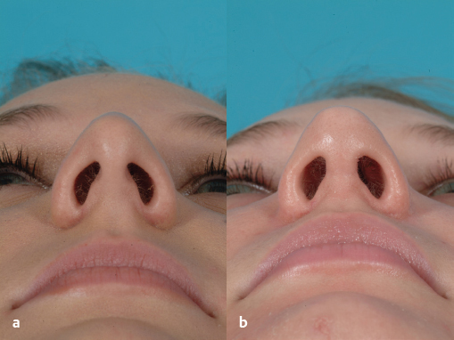 Important information about the columella, alar base, lobule, and nostrils is obtained on base view. The nose should have a rounded, equilateral triangular shape without any pinching or concavities between the tip and alar lobules on base view ( Fig. 33.8 ). 11 External nasal valve collapse is also best assessed on this view, which manifests as inward collapse of the nostril margin (alar collapse) upon inspiration. Various grafting techniques exist to surgically correct external valve collapse and are covered elsewhere in this book. 9 , 12