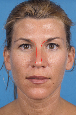 On frontal view, nasal symmetry and width of each vertical third are assessed. The brow-tip aesthetic line, which should be a subtle hourglassshaped curvilinear line between the medial brow and nasal tip, should follow a pattern of relative width at the bony vault, slight narrowing at the middle vault, and relative width again at the tip ( Fig. 33.6 ). It provides important information about contour irregularities. 10 Exaggeration of the curvature may indicate excessive width at the bony vault or tip, or it may indicate middle vault pinching. The transition from the columella to alar margins should be a gentle “gull in flight” configuration ( Fig. 33.7 ). An excessively low “body” may indicate either a hanging columella or retracted alae. The size and shape of the alae and alar base should also be examined, with emphasis on how the alar width and flare may be altered through increasing or decreasing tip projection. In some cases, alar base excisions may still be necessary to provide harmony with the remainder of the nose.
