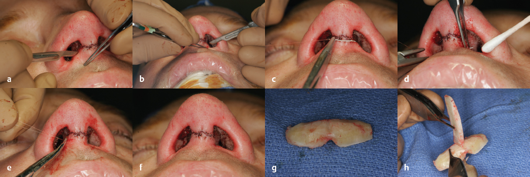 Furthermore, the caudal septum and columella should be palpated between the thumb and index finger to gain information about the relationship between those two structures. The caudal septum may be deviated or twisted, or the quadrangular cartilage may be overdeveloped, pushing the medial crura and columella inferiorly, creating the appearance of a hanging columella. The medial crura may be set back on an overly long caudal septum in a tonguein-groove fashion with or without excising a small strip of caudal septal cartilage to address the hanging columella. 8 In the vast majority of cases, however, the caudal septum does not require excision but rather should be preserved to avoid compromised tip support. In fact, a caudal septal extension graft (CSEG) is frequently placed to allow for medial crural setback. Knowledge of the width and length of the medial crura and columella is important, as this anatomical complex provides structural support. Short medial crura usually require placement of a columellar strut or caudal septal extension graft to provide tip support and thereby prevent postoperative loss of tip projection ( Fig. 33.4 ). 9