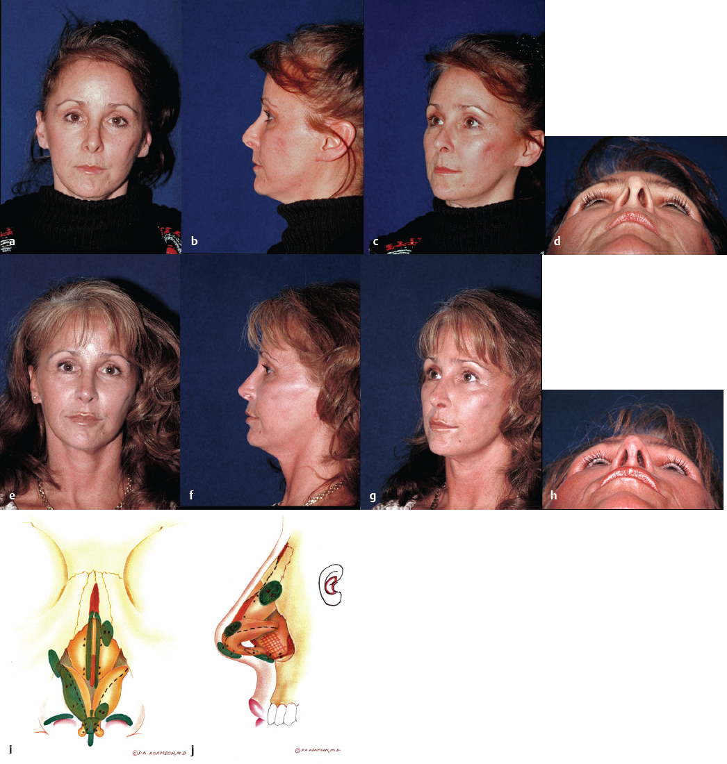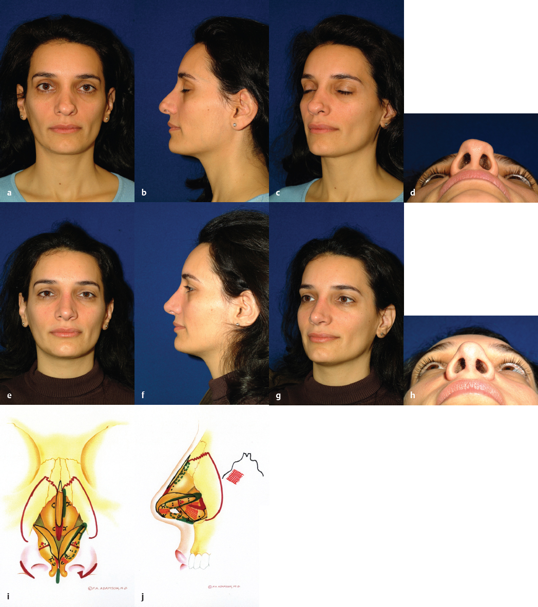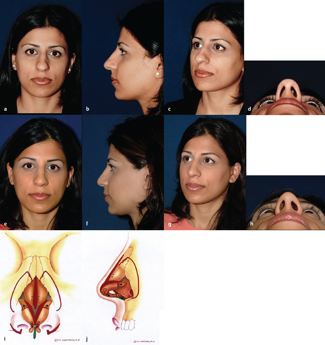 It is recognized that each rhinoplasty surgeon has a varied surgical experience and therefore will have unique indications for the open technique. In years past, the approach was grudgingly supported for difficult or revision cases. However, indications have expanded commensurate with widespread increasing levels of comfort and familiarity with this technique. In our experience, open rhinoplasty is the technique of choice for all cases unless a comparable improvement for a definable deformity can be obtained with the closed approach. The open approach offers clear diagnostic and therapeutic advantages for many challenging functional and cosmetic nasal deformities, primarily resulting from the broad undistorted exposure it affords. This is especially true with respect to the premaxillary spine, caudal septum, dorsal and superior septum, lobule, and superior dorsum. An unparalleled diagnosis of the underlying anatomy resulting in the external deformity can be made via the open approach. Sutures can be placed, grafts exactly trimmed, and asymmetries corrected without distortion of surrounding tissues. Scar tissue and redundant subcutaneous tissue are more easily excised. The valve region can be well protected, and the absence of incisions in the intercartilaginous region diminishes subsequent obstructive phenomena by precluding scar formation and disruption of one of the tip support mechanisms. A majority of facial plastic surgeons in North America now relies on this technique to achieve consistently good and reproducible results for a wide variety of indications ( Figs. 34.1–34.7 ).