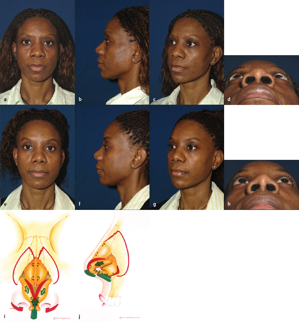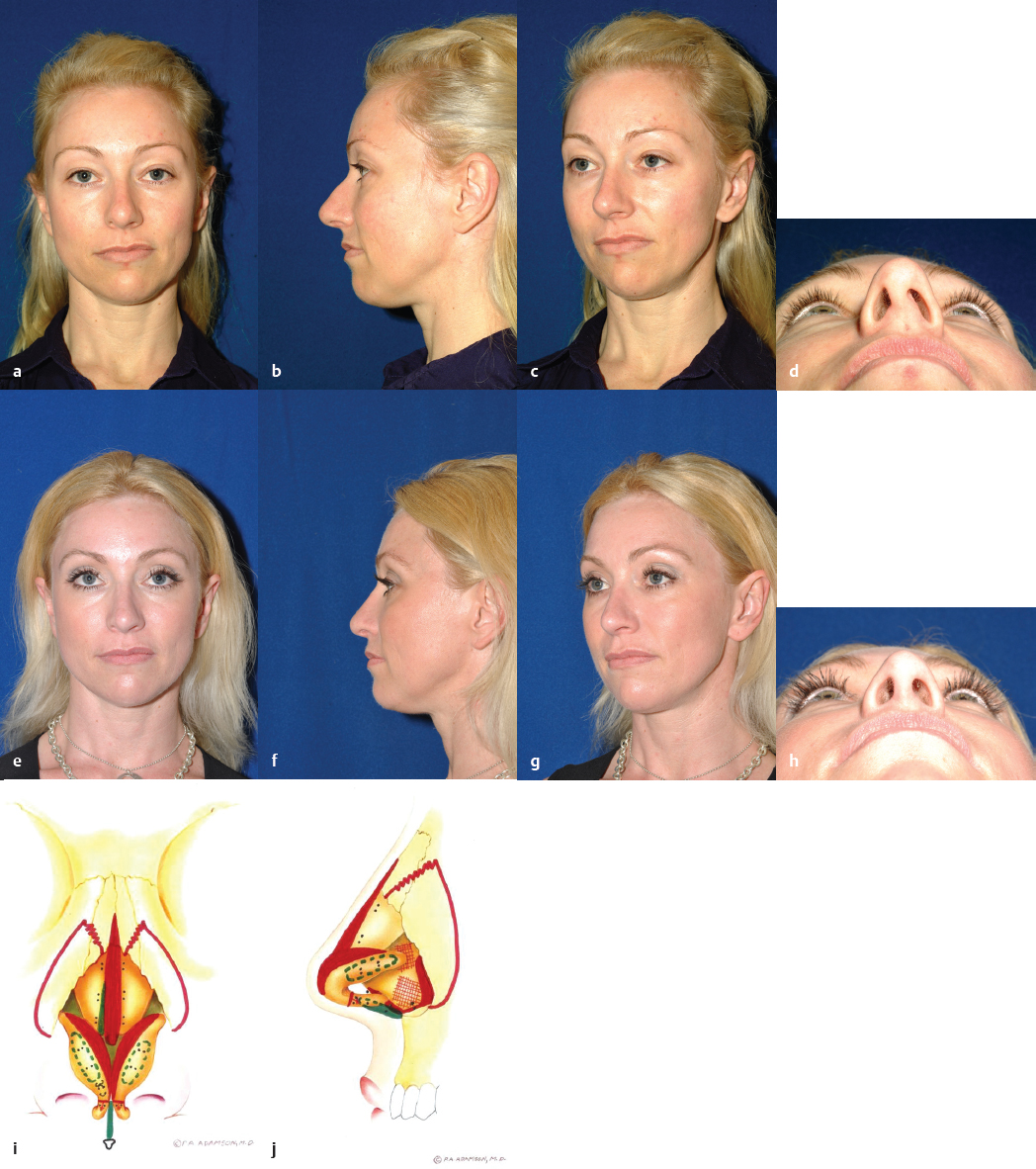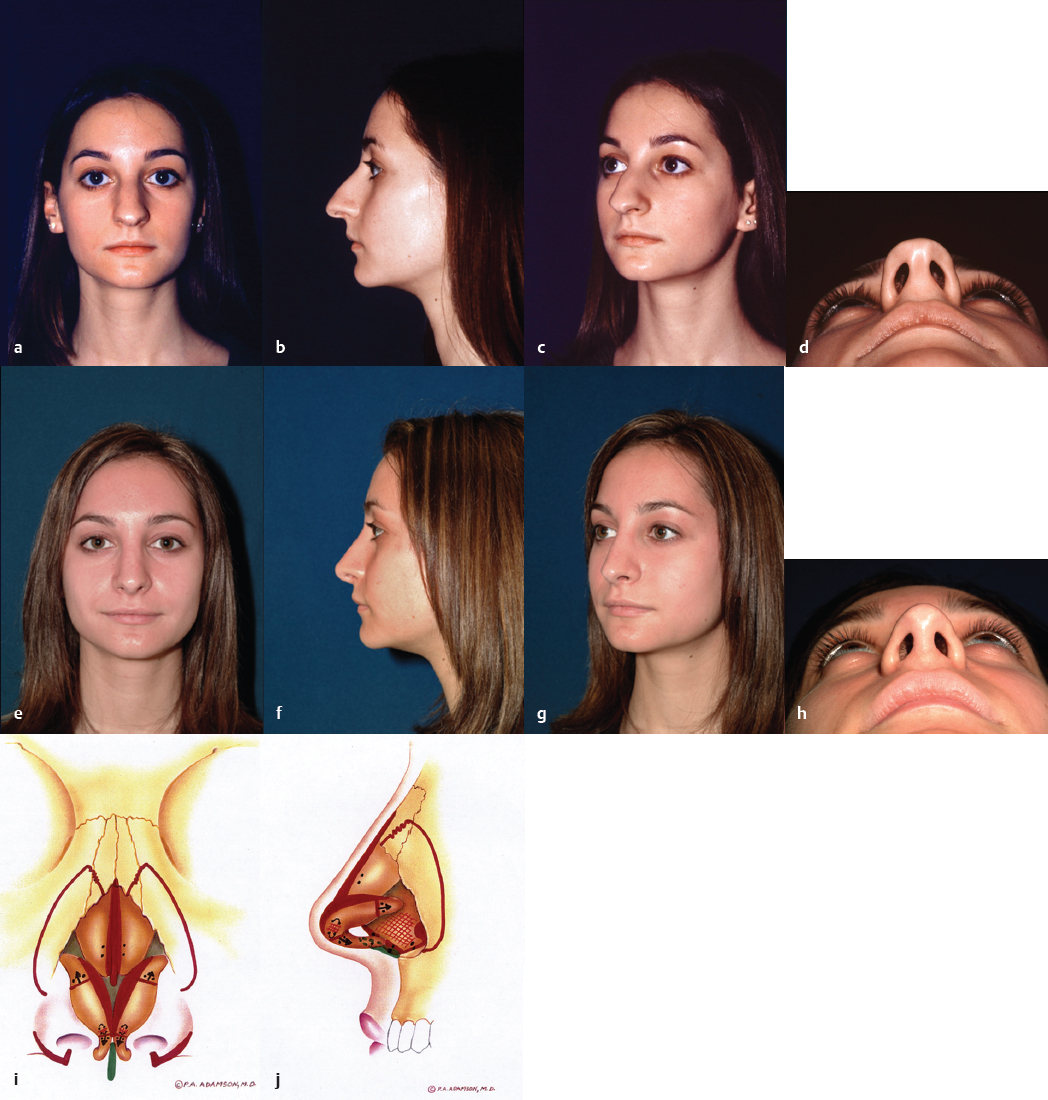 It is recognized that each rhinoplasty surgeon has a varied surgical experience and therefore will have unique indications for the open technique. In years past, the approach was grudgingly supported for difficult or revision cases. However, indications have expanded commensurate with widespread increasing levels of comfort and familiarity with this technique. In our experience, open rhinoplasty is the technique of choice for all cases unless a comparable improvement for a definable deformity can be obtained with the closed approach. The open approach offers clear diagnostic and therapeutic advantages for many challenging functional and cosmetic nasal deformities, primarily resulting from the broad undistorted exposure it affords. This is especially true with respect to the premaxillary spine, caudal septum, dorsal and superior septum, lobule, and superior dorsum. An unparalleled diagnosis of the underlying anatomy resulting in the external deformity can be made via the open approach. Sutures can be placed, grafts exactly trimmed, and asymmetries corrected without distortion of surrounding tissues. Scar tissue and redundant subcutaneous tissue are more easily excised. The valve region can be well protected, and the absence of incisions in the intercartilaginous region diminishes subsequent obstructive phenomena by precluding scar formation and disruption of one of the tip support mechanisms. A majority of facial plastic surgeons in North America now relies on this technique to achieve consistently good and reproducible results for a wide variety of indications ( Figs. 34.1–34.7 ).