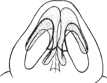 The gull-wing incision heals better aesthetically than V-shaped, staircase, or straight transverse incisions. It should curve around the caudal margin of the medial crus to meet the marginal incision at right angles. The marginal incision is placed just behind the caudal margin of the medial crus as this allows for both a wider columellar flap and improved scar camouflage. Care is taken to place the incision above the feet of the medial crura, especially in black and Asian patients in whom these structures are often foreshortened, and who are at risk for postoperative columellar notching. The columellar flap should be handled delicately to avoid jeopardizing its vascularity. The junction of the transverse columellar and vertical marginal incisions is most at risk for an unfavorable scar as forces of contraction tend to cause a trapdoor effect in this location. This effect can be minimized through undermining of the inferior columellar skin prior to closure, and by placement of the angle suture full thickness inferiorly but only partial thickness superiorly, to “tuck in” the thicker superior flap edge. A single, simple inverted 6-0 polyglycolic acid suture may be placed intradermally in the central columella to decrease tension. We prefer simple 6-0 nylon everting skin sutures alone for columellar closure. In cases where significant deprojection of the tip has been performed, the columellar flap may be slightly long. Truncation of the flap by 1 or 2 mm will diminish the risk of a mild hanging columella effect in this instance. Conversely, when significant tip projection has been achieved, the columellar flap may appear relatively short on closure. Closing tension can be relieved by bilateral inferior extension of the vertical marginal incisions, allowing development of an inferior columellar advancement flap. If this potential problem is recognized preoperatively, a V-shaped columellar incision may be later closed in a V-to-Y fashion to achieve a similar columellar lengthening, although this tends to leave a slightly inferior scar.