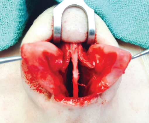 Septoplasty is usually performed first to correct functional problems and to obtain any cartilage that may be necessary for grafting. The superior septal angle is easily identified, and soft tissue is removed from between the medial crura down to the premaxilla. This provides excellent exposure of the caudal septum and allows the columella to be narrowed. This is especially helpful if a columellar strut is to be placed because struts widen the columella inferiorly. If nasolabial augmentation is required, this soft tissue may be retained as a flap based inferiorly and turned on itself to provide additional nasolabial angle augmentation. 14 It is secured with a throughandthrough premaxillary transfixion suture. More frequently, the soft tissue is excised to be used later as a camouflage graft if required. We often deepen or flatten the premaxilla at this juncture with a rongeur. The wide exposure offered by the open approach is much superior to closed techniques for this purpose. The nasal spine may be flattened to create an optimal platform for a columellar strut, but its excision is highly inadvisable. Beginning at the anterior septal angle, complete submucoperichondrial and submucoperiosteal septal flaps are elevated bilaterally. The upper lateral cartilages are separated from the septum such that the nasal dorsum and septum are ouvert au ciel, or open to the sky. This affords a superb undistorted view unavailable with closed techniques, allowing any desired septoplasty technique to be executed ( Fig. 34.9 ). Of note, the view is more anterosuperior than that seen in closed techniques and may require some adjustment of orientation in the mind’s eye.