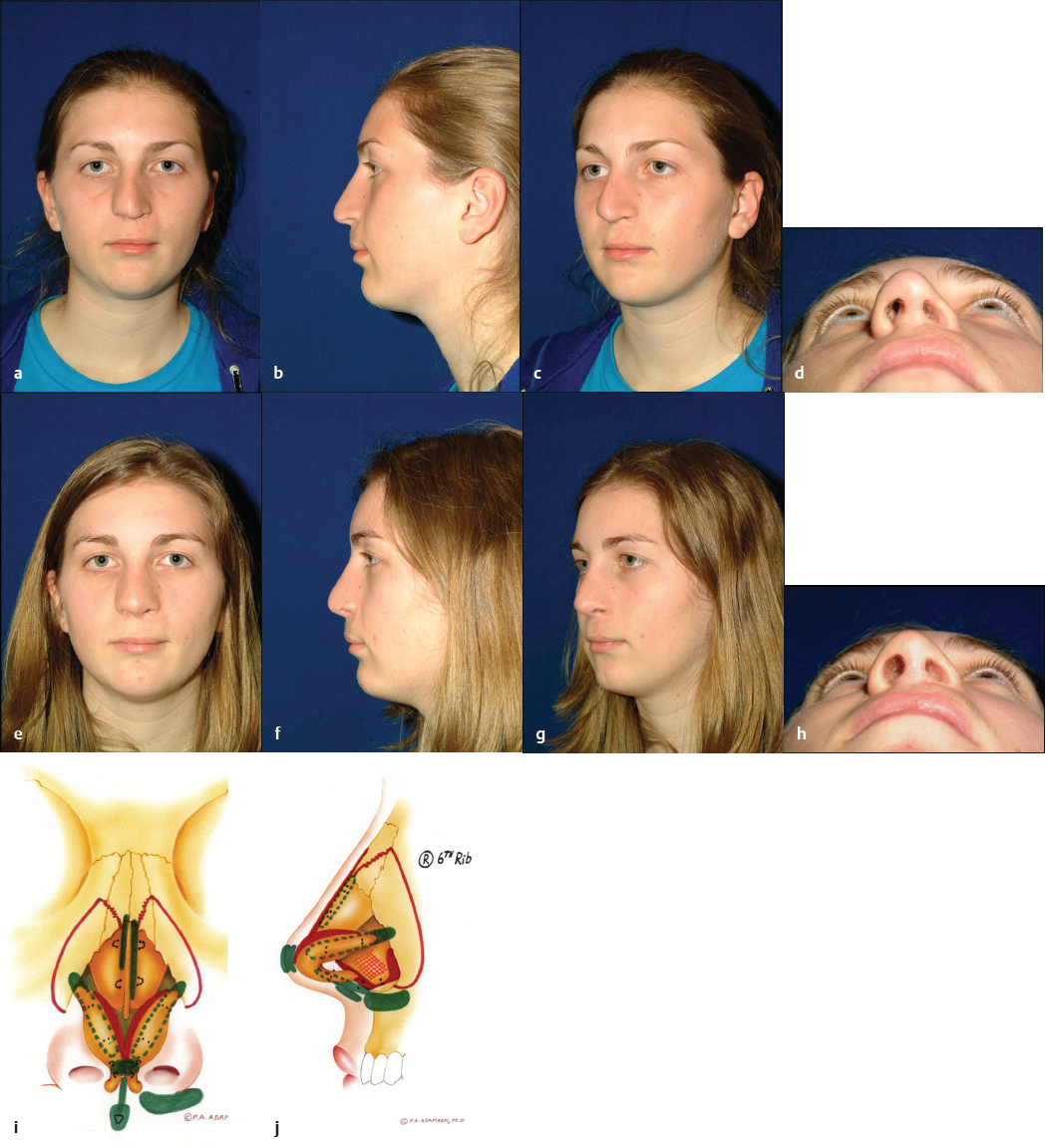 It is recognized that each rhinoplasty surgeon has a varied surgical experience and therefore will have unique indications for the open technique. In years past, the approach was grudgingly supported for difficult or revision cases. However, indications have expanded commensurate with widespread increasing levels of comfort and familiarity with this technique. In our experience, open rhinoplasty is the technique of choice for all cases unless a comparable improvement for a definable deformity can be obtained with the closed approach. The open approach offers clear diagnostic and therapeutic advantages for many challenging functional and cosmetic nasal deformities, primarily resulting from the broad undistorted exposure it affords. This is especially true with respect to the premaxillary spine, caudal septum, dorsal and superior septum, lobule, and superior dorsum. An unparalleled diagnosis of the underlying anatomy resulting in the external deformity can be made via the open approach. Sutures can be placed, grafts exactly trimmed, and asymmetries corrected without distortion of surrounding tissues. Scar tissue and redundant subcutaneous tissue are more easily excised. The valve region can be well protected, and the absence of incisions in the intercartilaginous region diminishes subsequent obstructive phenomena by precluding scar formation and disruption of one of the tip support mechanisms. A majority of facial plastic surgeons in North America now relies on this technique to achieve consistently good and reproducible results for a wide variety of indications ( Figs. 34.1–34.7 ).