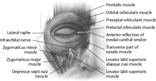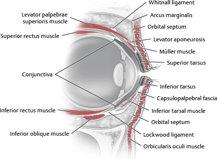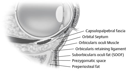 Orbicularis fascia: Firmly attached at posterior surface of orbicularis “sphincter”; fuses with levator aponeurosis at level of lid fold; offers mechanical and nutritional (possibly lymphatic) support 4