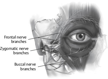 Frontal, zygomatic, and buccal contributions from facial nerve (CN VII)
