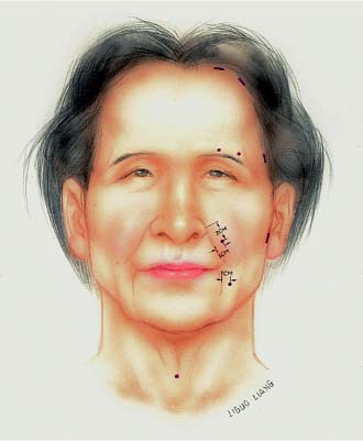 The procedure is almost always done in the office setting with the patient under local anesthesia, 0.5% lidocaine with 1/200,000 epinephrine. An oral sedative preoperatively may make patients more comfortable. Vectors are marked on the face using a marking pen. The eyebrow vector is marked from the mid-eyebrow to the hairline and lateral aspect of the brow to the hairline. The midface vector is marked from 2 cm inferior to the apex of the nasolabial fold and 1 cm lateral to the fold along a line that bisects a point 1 cm lateral to the lateral canthus and ends 2 cm into the hairline. The lower face vector starts 1 cm lateral to the lower nasolabial fold at the level 1 cm below the lip commissure. This extends laterally to a point of juncture of the lower tragus with the lobule and ends at the preauricular sulcus. The neck sutures start at an 8 mm incision in the midline at the level of the cricoid cartilage ( Figs. 34.1 and 34.2 ). The suture is passed in the deep subcutaneous level along a vector from the midline to the mastoid prominence. When the second half of the suture is passed, the two sutures are intertwined at the midline ( Fig. 34.3 ). In patients with mild skin excess, a preauricular incision may be marked, extending from the temporal hair into a tragal incision, and to the ear lobule or just posterior to the lobule in the postauricular crease. Minimal skin undermining in the preauricular area is planned in these cases, usually less than 2 cm. In many cases, after the malar fat pad and lower lid fullness is restored, only a simple lateral pinch blepharoplasty and canthopexy are needed to restore the youthful contour to the lower lid. The upper lid is significantly improved with the eyebrow lift, and, if needed, a limited excision of skin is added above the palpebral fold.