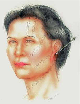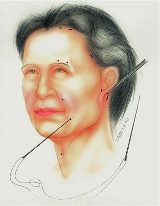 Lidocaine with epinephrine is infiltrated along the vector lines and in any lid or preauricular skin excision areas. The brow hairline sutures are secured to the galea; the midface sutures are secured to the temporalis fascia; the lower face suture is secured to the SMAS over the parotid; and the neck sutures are secured to the periosteum of the mastoid prominence. The levels of the sutures are as follows: the forehead at the level of the galea, and the midface through Bichat’s fat pad and then along the superficial aspect of the orbicularis oculi muscle to the temporalis fascia. The lower face is through the SMAS and secured to the preauricular SMAS. The neck sutures are passed at the deep subcutaneous level, exiting at the mastoid and secured to the periosteum of the mastoid.