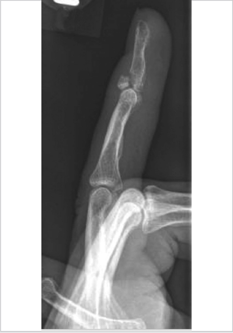 Fig. 35.1 Lateral xray of a finger with an extensor tendon avulsion fracture at the level of the distal interphalangeal joint. The fracture involves about 50% of the articular surface of the distal phalanx.