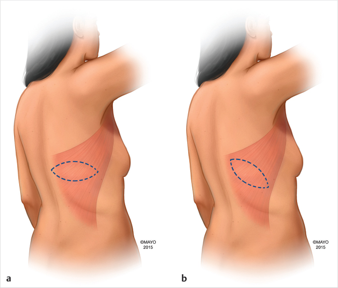 Fig. 35.1 (a,b) Preoperative markings. The back ellipse is placed in the bra line but can be angled anteroinferiorly for a larger skin island if needed in delayed reconstruction. Reprinted with permission of Mayo Foundation for Medical Education and Research. All rights reserved.