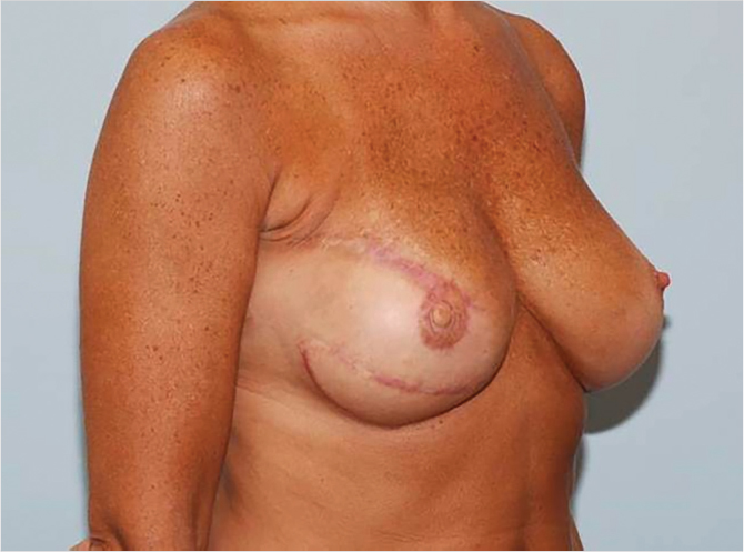 Fig. 35.3 Latissimus dorsi myocutaneous flap (LDMF) skin island placed into the inframammary fold. In this case, placing it into the old mastectomy defect would have left the patient with a very high scar.