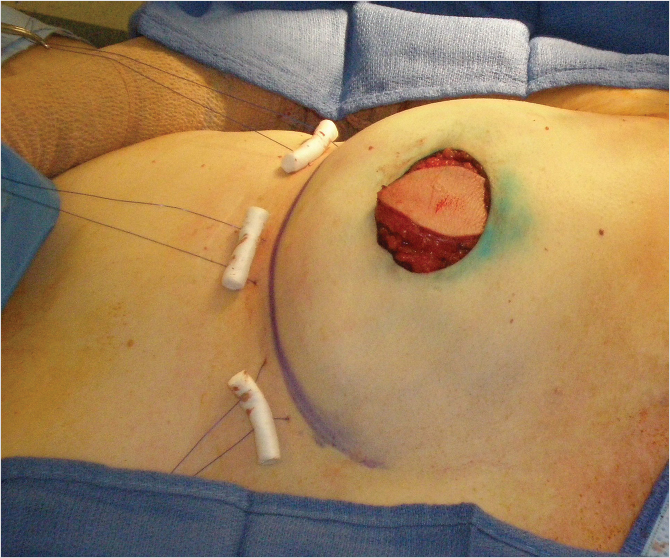 Fig. 35.4 The use of bolsters to inset the latissimus muscle into the inframammary fold is illustrated in this image. The skin will be de-epithelialized to match the skin-sparing mastectomy defect.