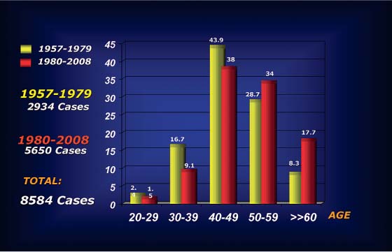 Photographic studies with computerized analysis were done in the same patient at different ages, determining the parameters of change that occurred during the aging process. The sample for this research was restricted to a group of 40 white female patients with a history of limited exposure to the sun and who first presented to our service in their childhood, usually for the correction of prominent ears, and returned later for additional surgery, such as rhinoplasty, and finally, at a more advanced age, returned for facelifting. All photographs were taken under the same conditions for preoperative documentation. The choice of aging parameters was based on facial changes that occurred over a period of time, so that the first photograph of each patient was used as a pattern for the subsequent study. The computer model suggests that the most adequate direction of repositioning of the facial flaps is the one described in the Pitanguy round-lifting technique. A line connecting the tragus to Darwin’s tubercle represents the best direction for repositioning of the aging face, with less tension exerted.1,2 Clinically, this has proven to be the most appropriate method for repositioning the facial tissues. Rhytidoplasty is one of the most frequently performed surgeries in the practice of plastic surgeons.3–9 In the senior author’s private clinic, a total of 8584 personal consecutive cases have been analyzed to date ( Fig. 36.1 ).
