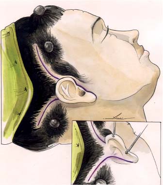 Likewise, the cervical flap should be pulled in an equally precise manner, in a superior and slightly anterior vector of traction, to avoid a step-off of the hairline. Key stitches are placed to anchor the flap along the pilose scalp at point B so that there is no tension on the thin skin at the peak of the retroauricular incision. This incision creates an advancement flap that prevents a step-off in the hairline, allowing the patient to wear her hair up without revealing the scar.