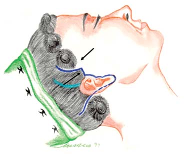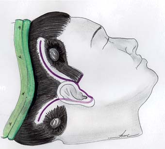 Undermining of the facial and cervical flaps is performed in a subcutaneous plane, the extension of which is variable and individualized for each case. A danger area lies beneath the non-hair-bearing skin over the temples, which we have called “no-man’s-land,” where most of the temporofrontal branches of the facial nerve and temporal artery are frequently found. The no-man’s-land is an area along a line connecting the tragus to the supraorbital rim.15,16 Dissection over this area should be superficial and hemostasis carefully performed.