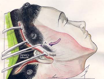 This vector of reposition connects the tragus to Darwin’s tubercle for the facial or anterior flap. A Pitanguy flap demarcator (Padgett Instruments, Kansas City, MO) is placed at the root of the helix to mark point A on the skin flap ( Fig. 36.6 ). The edge of the flap is then incised along a curved line crossing the supra-auricular hairline so that bald skin, not containing hair follicles, is resected. A key suture is located here.
