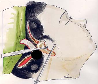 The second approach is the juxtapilose incision,23 performed when the patient presents with ptosis of lateral eyebrow and scant lines of expression of the forehead. After the execution of a limited juxtapilose incision in the hairline, subperiosteal undermining is done in the whole forehead, reaching the superior orbital rim while preserving the supraorbital neurovascular bundle and frontal nerve. The orbital ligament near the zygomaticofrontal suture line and the periosteal attachments along the superior orbital rim and the temporal line are released by blunt dissection with a periosteal elevator. The elevation of the eyebrow and the frontal area as a whole is executed in a superolateral direction ( Fig. 36.10 ).