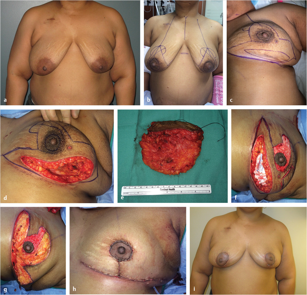 Perhaps the most popular and versatile breast reshaping options are the mastopexy or reduction techniques. The ideal patient is one where the tumor can be excised within the expected breast reduction specimen, in medium to large or ptotic breasts where sufficient breast parenchyma remains following resection to reshape the mound. Masetti et al described a four-step design for oncoplastic operations: (1) planning skin incisions and parenchymal excisions following reduction/mastopexy templates, (2) parenchymal reshaping following excision, (3) repositioning the nipple, and (4) correction of the contralateral breast for symmetry. 33 Any moderate to large breast can be reconstructed using these techniques unless a skin deformity exists beyond the standard Wise pattern.
