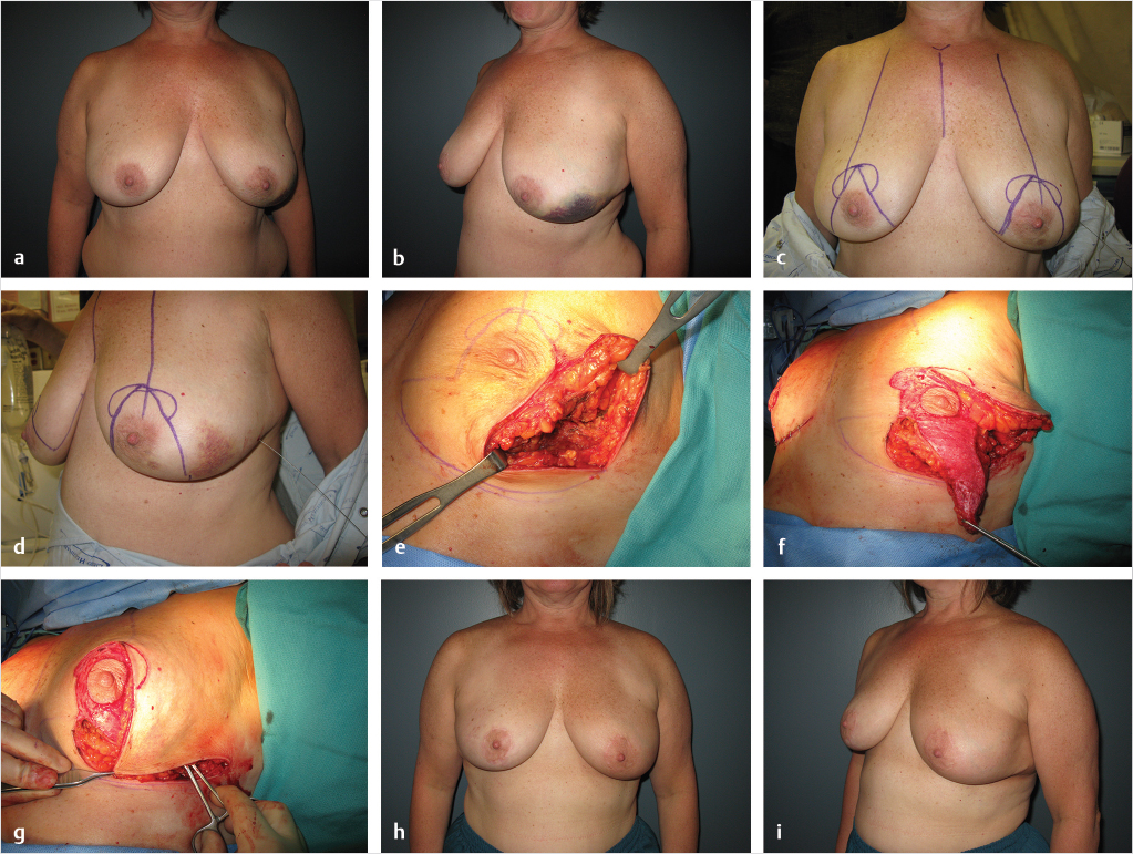 Fig. 36.2 (a,b) This is a 51 year old female with a left lower lateral quadrant DCIS with a left lower lateral quadrant DCIS. (c,d) She had wire localization and was marked with the Wise pattern. (e) After a 60 gram partial mastectomy she was left with a large lateral defect. It was felt that additional tissue needed to be rotated to fill the defect, rather than just using the residual lateral tissue. (f,g) This was reconstructed with an extended superomedial pedical and an additional 30 gram resection from the left side. (h,i) A contralateral reduction of 120 grams was performed. She is shown 1 year following completion of left sided radiation therapy.